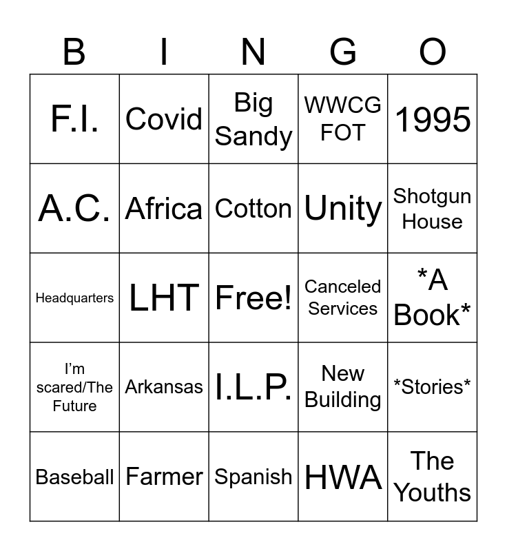 This bingo card has a free space and 24 words: Arkansas, Farmer, Cotton, Baseball, 1995, F.I., A.C., Covid, Canceled Services, I.L.P., Unity, Headquarters, New Building, *Stories*, Africa, HWA, *A Book*, Big Sandy, Shotgun House, LHT, The Youths, I’m scared/The Future, WWCG FOT and Spanish.