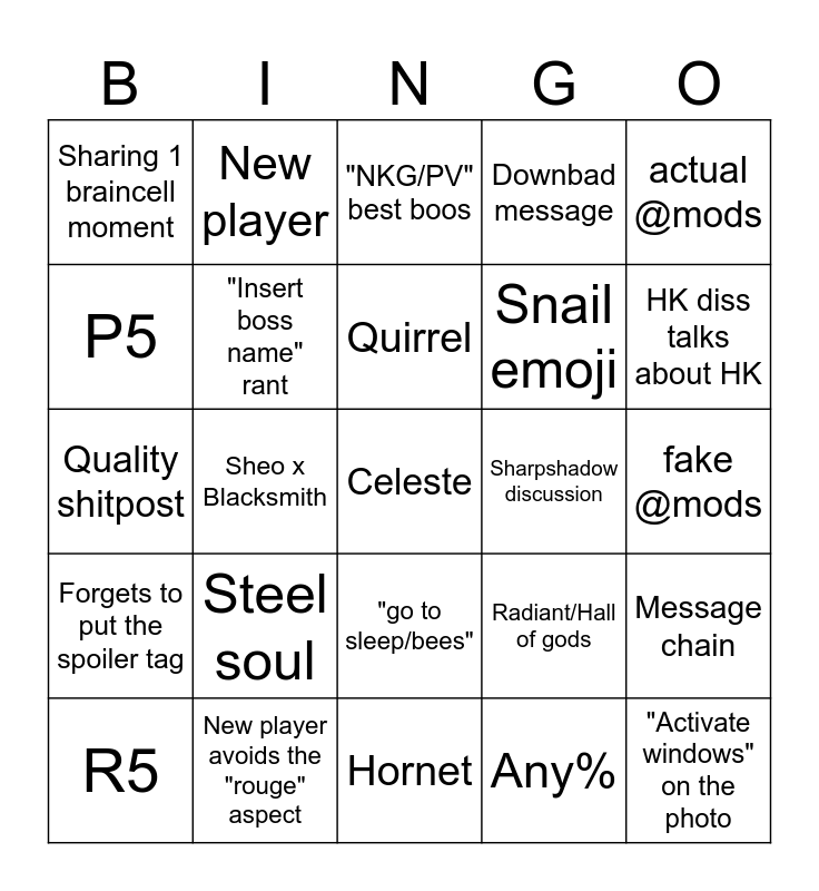 This bingo card has a free space and 24 words: Steel soul, New player avoids the "rouge" aspect, Quirrel, R5, actual @mods, Sharing 1 braincell moment, P5, New player, Sharpshadow discussion, "go to sleep/bees", Snail emoji, Quality shitpost, Radiant/Hall of gods, Message chain, "Insert boss name" rant, Any%, fake @mods, "NKG/PV" best boos, HK diss talks about HK, Sheo x Blacksmith, "Activate windows" on the photo, Forgets to put the spoiler tag, Downbad message and Hornet.