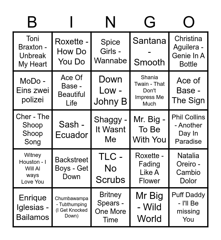 This bingo card has 111 words: Nirvana - Smeels Like Teen Spirit, 2 Unlimited - No Limit, R.E.M - Losing My Religion, Eiffel 65 - Blue, Haddaway - What is Love, Darude - Sandstorm, No Doubt - Don't Speak, No Mercy - Where Do You Go, Ricky Martin - Livin La Vida Loca, The Rembrants - I'll Be There For You (Friends Theme), ATB - 9PM (Till I Come), Backstreet Boys - Everybody, Metallica - Nothing Else Matters, Madonna - Frozen, Red Hot Chili Peppers - Otherside, TLC - Waterfalls, TLC - No Scrubs, 4 Non Blondes - Whats Up?, ATC - Around the World (La La La La La), Cher - Believe, Enrique Iglesias - Bailamos, Spice Girls - Wannabe, Spice Girls - Viva Forever, Eternal - I Wanna Be The Only One, Guns N Roses - November Rain, Witney Houston - I Will Always Love You, Chumbawampa - Tubthumping (I Get Knocked Down), Sinead O'Conor - Nothing Compares To You, Coolio - Gangsters Paradise, Whitney Houston - My Love is Your Love, Toni Braxton - Unbreak My Heart, Sash - Ecuador, Puff Daddy - I'll Be missing You, Corona - Rhythm Of The Night, Snap - Rhythm Of The Night, La Bouche - Be My Lover, Maggie Reilly - Everytime We Touch, Mc Sar The Real McCoy Its On You, Celine Dion - My Heart Will Go On, Celine Dion - Thats The Way It Is, Bomfunk MCs - Free Styler, Culture Beat - Mr. Vain, Seal - Kiss From a Rose, Nana - Lonely, Down Low - Johny B, Doctor Delite - Paris Red, Britney Spears - One More Time, Britney Spears - You Drive Me Crazy, Michael Jackson - Will You Be There, Michael Jackson - They dont care about us, Michael Jackson - Black or white, Depeche Mode - Enjoy The Silence, Desree - You Gotta Be, Desree - Life, Dr Alban - Its my life, Everything But The Girl - Missing, MoDo - Eins zwei polizei, Fun Factory - I Wanna B With U, Scorpions - Wind Of Change, Soul Asylum- Runaway Train, Spin Doctors Two Princes, Take That - Back For Good, The Connells - 74 - 75, Mr President - Coco Jambo, Mc Sar The Real McCoy - Its On You, Shania Twain - That Don't Impress Me Much, Lenny Kravitz - Fly Away, Lene Marlin - Sitting Down Here, Liquido - Narcotic, Ace Of Base - Beautiful Life, Ace of Base - The Sign, Ace of Base - All That She Wants, Bryan Adams - (Everything I Do) I Do It For You, Bryan Adams - Cloud 9, savage garden - truly madly deeply, savage garden - to the moon and back, Richard Marx - Right Here Waiting For You, Sting - Shape of my Heart, Sting - Fields of Gold, Backstreet Boys - Get Down, Backstreet Boys - As Long As You Love Me, Mr Big - Wild World, Mr. Big - To Be With You, Natalia Oreiro - Cambio Dolor, Natalie Imbruglia - Torn, Red Hot Chili Peppers - Californication, Santana - Smooth, Shaggy - Bombastic, Shaggy - It Wasnt Me, Sonique - Sky, Christina Aguilera - Genie In A Bottle, 2PAC - Changes, Kurt Nilsen - She's So High, Pet Shop Boys - Go West, Sixpence None The Richer - Kiss Me, Wet Wet Wet - Love is all Arround, Cher - The Shoop Shoop Song, Aerosmith - Cryin, Aerosmith - Crazy, Queen - The Show Must Go On, Scatman John - Scatman, MC Hammer - U Can't Touch This, Roxette - Joyride, Roxette - It Must Have Been Love, Roxette - Fading Like A Flower, Roxette - How Do You Do, Vanilla - Ice Ice Baby, Roxette - Almost Unreal, Aerosmit - i don't want to miss a thing, Phil Collins - Another Day In Paradise and Mr President - Coco Jambo.