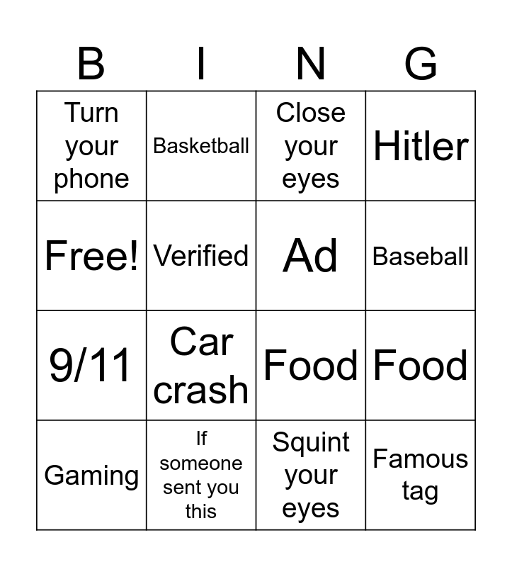 This bingo card has 22 words: 9/11, Offensive meme, Ad, Famous tag, Turn your phone, Verified, Close your eyes, Hitler, Free!, If someone sent you this, Squint your eyes, Baseball, Gaming, No word starts and ends with, Nig for sale comment, Fat clip, Car crash, Daily clip, Food, Basketball, Food and Plane not 9/11 related.
