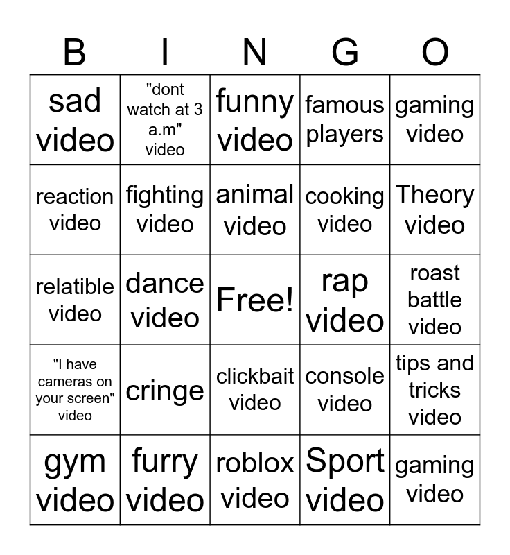 This bingo card has a free space and 24 words: cringe, furry video, animal video, gym video, gaming video, sad video, reaction video, "dont watch at 3 a.m" video, rap video, clickbait video, cooking video, relatible video, console video, tips and tricks video, fighting video, Sport video, roast battle video, funny video, Theory video, dance video, gaming video, "I have cameras on your screen" video, famous players and roblox video.