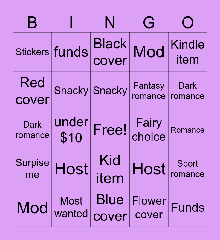 This bingo card has a free space and 24 words: Host, Most wanted, Snacky, Mod, Kindle item, Stickers, Red cover, funds, Fairy choice, Kid item, Fantasy romance, Dark romance, Host, Sport romance, Snacky, Flower cover, Romance, Black cover, Dark romance, under $10, Funds, Surpise me, Mod and Blue cover.