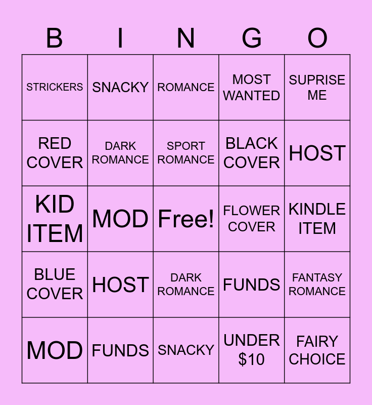This bingo card has a free space and 24 words: HOST, FUNDS, SPORT ROMANCE, MOD, SUPRISE ME, STRICKERS, RED COVER, SNACKY, FLOWER COVER, DARK ROMANCE, BLACK COVER, KID ITEM, FUNDS, FANTASY ROMANCE, DARK ROMANCE, UNDER $10, KINDLE ITEM, ROMANCE, HOST, MOD, FAIRY CHOICE, BLUE COVER, MOST WANTED and SNACKY.