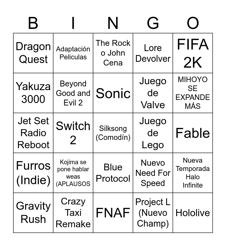 This bingo card has a free space and 24 words: Kojima se pone hablar weas (APLAUSOS, Crazy Taxi Remake, Sonic, Gravity Rush, FIFA 2K, Dragon Quest, Yakuza 3000, Adaptación Peliculas, Juego de Lego, Blue Protocol, Juego de Valve, Jet Set Radio Reboot, Nuevo Need For Speed, Nueva Temporada Halo Infinite, Beyond Good and Evil 2, Project L (Nuevo Champ), Fable, The Rock o John Cena, MIHOYO SE EXPANDE MÁS, Switch 2, Hololive, Furros (Indie), Lore Devolver and FNAF.