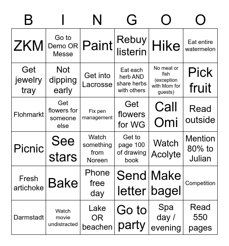 This bingo card has 36 words: Send letter, Phone free day, Go to party, Get jewelry tray, Picnic, Get flowers for WG, Not dipping early, Lake OR beachen, Hike, Make bagel, Pick fruit, Rebuy listerin, Competition, Get flowers for someone else, Eat each herb AND share herbs with others, ZKM, Fresh artichoke, Call Omi, Flohmarkt, Paint, Fix pen management, See stars, Get to page 100 of drawing book, Watch something from Noreen, Watch Acolyte, Go to Demo OR Messe, No meat or fish (exception with Mom for guests), Watch movie undistracted, Get into Lacrosse, Eat entire watermelon, Read 550 pages, Darmstadt, Mention 80% to Julian, Read outside, Bake and Spa day / evening.