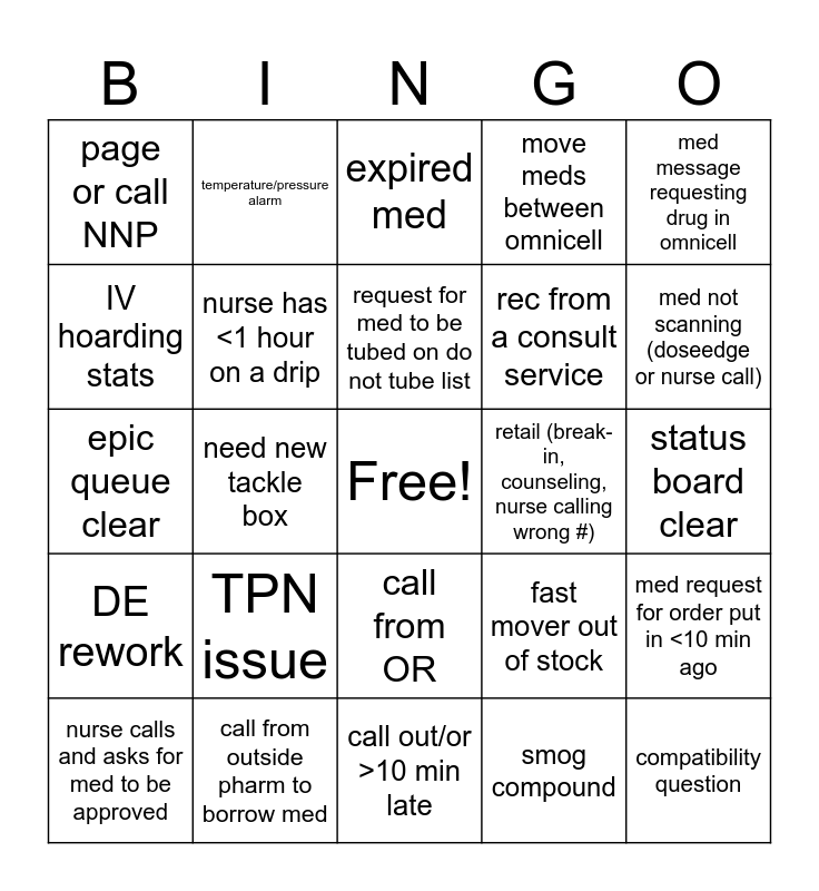 This bingo card has a free space and 50 words: weird/inappropriate item in return bin, compatibility question, can I crush/does this go in a gtube, call out/or >10 min late, TPN issue, stat alteplase, temperature/pressure alarm, D/C TPN, IV hoarding stats, picu missing med, nurse has <1 hour on a drip, move meds between omnicell, med request for order put in <10 min ago, fast mover out of stock, tube station down, page on call, request for med to be tubed on do not tube list, retail (break-in, counseling, nurse calling wrong #), call to borrow a med, med message requesting drug in omnicell, need new tackle box, smog compound, page or call NNP, rec from a consult service, med sent secure returns in tube, omnicell discrepancy, med not scanning (doseedge or nurse call), code pager goes off, expired med, call from OR, new DKA needs bags STAT, doseedge bypass, brand new TPN, new LOS/EOS orders, call from outside pharm to borrow med, tube shut down for full tube, request for vfc vaccine, recon antibiotic, ID home med, status board clear, request for on call electrolytes, omnicell issue, med message requesting med scanned into med bin, phone call from MD needing dose recommendation, nurse calls and asks for med to be approved, epic queue clear, Door bell to pharmacy, IV room calls out for stock, DE rework and need to waste for a narc.