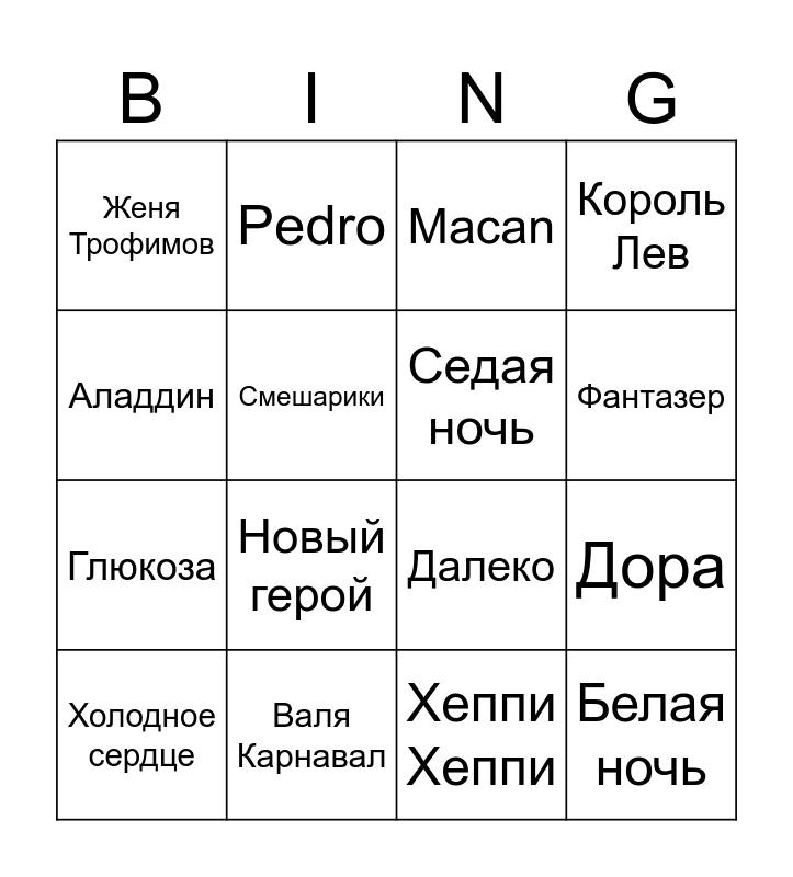 This bingo card has 16 words: Валя Карнавал, Дора, Macan, Женя Трофимов, Глюкоза, Pedro, Далеко, Хеппи Хеппи, Аладдин, Смешарики, Холодное сердце, Король Лев, Новый герой, Фантазер, Седая ночь and Белая ночь.