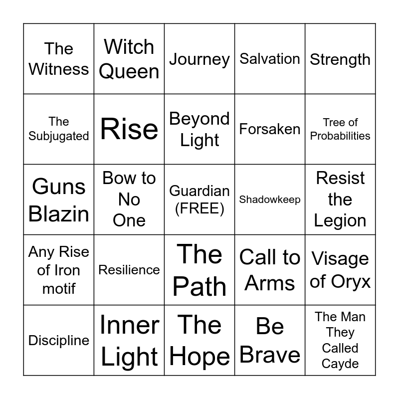 This bingo card has a free space and 24 words: Resilience, Inner Light, Beyond Light, Discipline, Strength, The Witness, The Subjugated, Witch Queen, Shadowkeep, The Path, Forsaken, Guns Blazin, Call to Arms, Visage of Oryx, Rise, Be Brave, Resist the Legion, Journey, Tree of Probabilities, Bow to No One, The Man They Called Cayde, Any Rise of Iron motif, Salvation and The Hope.