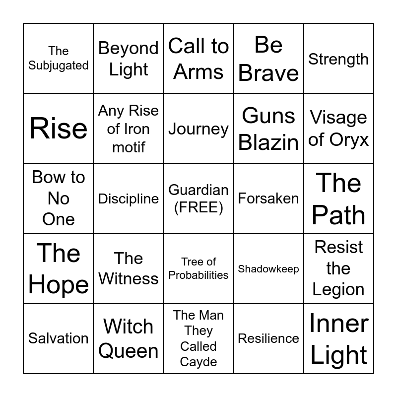 This bingo card has a free space and 24 words: The Witness, Witch Queen, Journey, Salvation, Strength, The Subjugated, Rise, Beyond Light, Forsaken, Tree of Probabilities, Guns Blazin, Bow to No One, Shadowkeep, Resist the Legion, Any Rise of Iron motif, Resilience, The Path, Call to Arms, Visage of Oryx, Discipline, Inner Light, The Hope, Be Brave and The Man They Called Cayde.