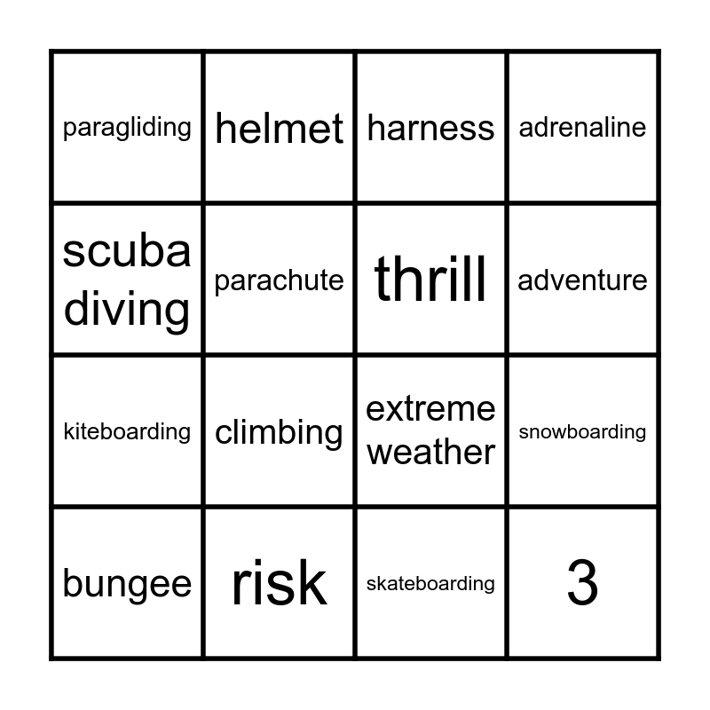 This bingo card has 17 words: skateboarding, bungee, harness, paragliding, climbing, adrenaline, snowboarding, thrill, adventure, parachute, risk, extreme weather, scuba diving, helmet, kiteboarding, surfing and 3.