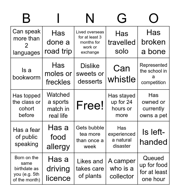 This bingo card has a free space and 25 words: Has a food allergy, Likes and takes care of plants, Dislike sweets or desserts, Born on the same birthdate as you (e.g. 5th of the month), Has broken a bone, Can speak more than 2 languages, Is a bookworm, Has done a road trip, Has stayed up for 24 hours or more, Gets bubble tea more than once a week, Can whistle, Has topped the class or cohort before, Has experienced a natural disaster, Is left-handed, Has moles or freckles, Eats liver, kidney, intestines etc., Has owned or currently owns a pet, Lived overseas for at least 3 months for work or exchange, Represented the school in a competition, Watched a sports match in real life, Queued up for food for at least one hour, Has a driving licence, Has a fear of public speaking, Has travelled solo and A camper who is a collector.