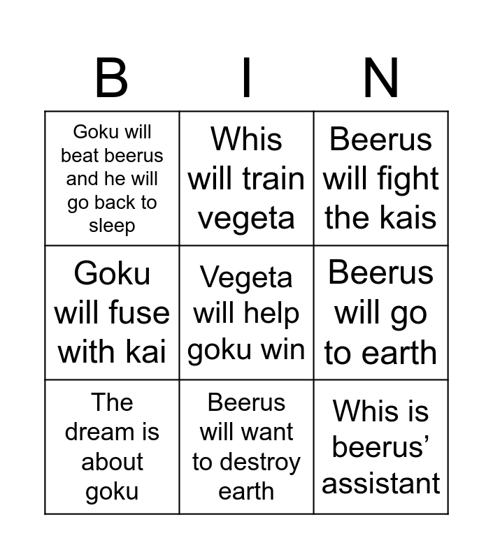 This bingo card has a free space and 8 words: Goku will fuse with kai, Whis will train vegeta, Beerus will go to earth, The dream is about goku, Beerus will fight the kais, Goku will beat beerus and he will go back to sleep, Beerus will want to destroy earth and Whis is beerus’ assistant.
