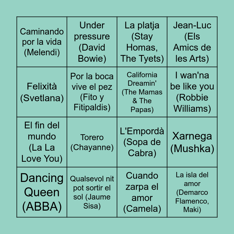 This bingo card has 52 words: Benvolgut (Manel), Dancing Queen (ABBA), Rosas (La Oreja de Van Gogh), Antes muerta que sencilla (María Isabel), Tots som súper (SX3), Mamma Mia (ABBA), Under pressure (David Bowie), How sweet it is (to be loved by you) (James Taylor), Por la boca vive el pez (Fito y Fitipaldis), Volare (Gipsy Kings), California Dreamin' (The Mamas & The Papas), Viure sense tu (Antonia Font), I got a feeling (Black Eyed Peas), Murder on the dancefloor (Sophie Ellis-Bextor), Love story (Taylor Swift), Coti x coti (The tyets), I wan'na be like you (Robbie Williams), Qualsevol nit pot sortir el sol (Jaume Sisa), Bailoteo (The tyets), Felixità (Svetlana), Xarnega (Mushka), Let's dance (David Bowie), Caminando por la vida (Melendi), El fin del mundo (La La Love You), Marta, Sebas, Guille y los demás (Amaral), La revolución sexual (La Casa Azul), Let me out (Dover), Don't stop the music (Rihanna), Torero (Chayanne), Mayonesa (Chocolate), Hips don't lie (Shakira), Jean-Luc (Els Amics de les Arts), Estaré millor demà (Marlena, The Tyets), Serem ocells (Oques Grasses), L'Eva i la Jana (Ginestà), La platja (Stay Homas, The Tyets), Precari-eté (Maio, La Bajas Pasiones), I will wait (Mumford & sons), Física o química (Despistaos), Mari Carmen (La Pegatina), Yo quiero bailar (Sonia y Selena), Cuando zarpa el amor (Camela), La isla del amor (Demarco Flamenco, Maki), Ave María (David Bisbal), Boig per tu (Sau), Escriurem (Miki Nuñez), Dramas y comedias (Fangoria), L'Empordà (Sopa de Cabra), Despechá (Rosalia), Hay que venir al sur (Raffaella Carrà), Wannabe (Spice Girls) and Love is in the air (John Paul Young).
