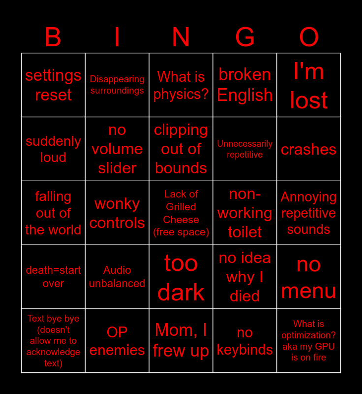 This bingo card has a free space and 35 words: graphic glitches, laggy gameplay, audio out of sync, no volume slider, too dark, broken English, suddenly loud, suddenly quiet, clipping out of bounds, Screen tearing, falling out of the world, I'm lost, missing barriers, "I lost my sh*t", settings reset, non-working toilet, no keybinds, wonky controls, death=start over, What is optimization? aka my GPU is on fire, no idea why I died, Text bye bye (doesn't allow me to acknowledge text), no menu, OP enemies, What is physics?, crashes, Invisible walls, Unfinished game, Unnecessarily repetitive, Annoying repetitive sounds, Broken save system, Mom, I frew up, Audio unbalanced, Disappearing surroundings and You spin me right round-mouse sensitivity way too high.