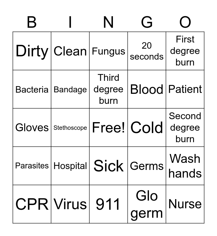 This bingo card has a free space and 24 words: Hospital, Virus, Third degree burn, CPR, First degree burn, Dirty, Bacteria, Clean, Cold, Sick, Blood, Gloves, Germs, Wash hands, Bandage, Glo germ, Second degree burn, Fungus, Patient, Stethoscope, Nurse, Parasites, 20 seconds and 911.