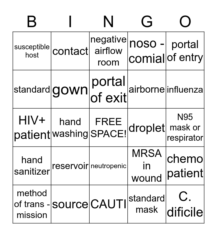 This bingo card has a free space and 24 words: reservoir, source, portal of exit, method of trans - mission, portal of entry, susceptible host, standard, contact, droplet, neutropenic, airborne, HIV+ patient, MRSA in wound, chemo patient, gown, standard mask, N95 mask or respirator, negative airflow room, influenza, hand washing, C. dificile, hand sanitizer, noso -comial and CAUTI.