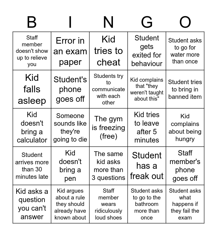 This bingo card has a free space and 24 words: Kid doesn't bring a pen, Kid argues about a rule they should already have known about, Students try to communicate with each other, Kid asks a question you can't answer, Student asks to go for water more than once, Staff member doesn't show up to relieve you, Kid falls asleep, Error in an exam paper, Kid tries to leave after 5 minutes, The same kid asks more than 3 questions, Kid complains that "they weren't taught about this", Kid doesn't bring a calculator, Student has a freak out, Staff member's phone goes off, Student's phone goes off, Student asks to go to the bathroom more than once, Kid complains about being hungry, Kid tries to cheat, Student tries to bring in banned item, Someone sounds like they're going to die, Student asks what happens if they fail the exam, Student arrives more than 30 minutes late, Student gets exited for behaviour and Staff member wears ridiculously loud shoes.