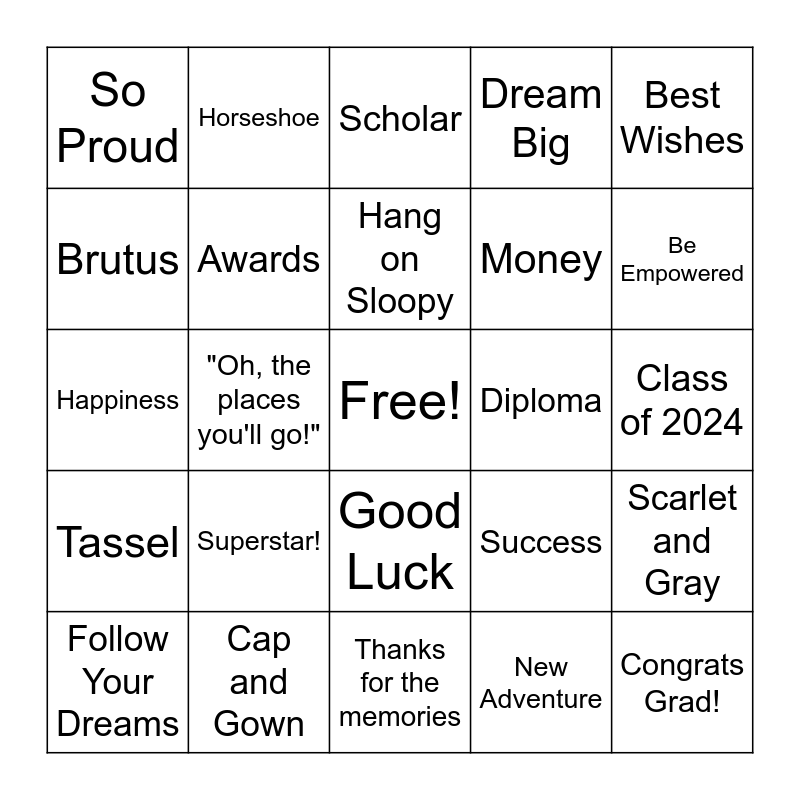 This bingo card has a free space and 29 words: Follow Your Dreams, Buckeye Bound, "Oh, the places you'll go!", Watch Out World, So Proud, Scholar, Awards, Superstar!, Diploma, Cap and Gown, Class of 2024, Congrats Grad!, Thanks for the memories, New Adventure, Be Empowered, Never Stop Learning, Good Luck, Tassel, Best Wishes, Happiness, Success, You did it!, Money, Brutus, Dream Big, Horseshoe, Scarlet and Gray, Hang on Sloopy and Class of 2028.