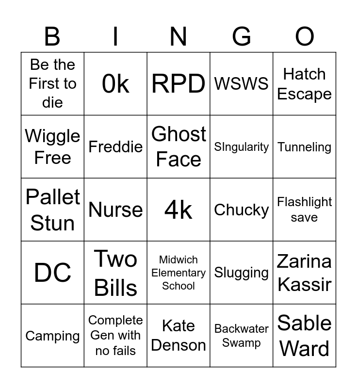 This bingo card has 30 words: Complete Gen with no fails, Mori, Nurse, Unhook yourself, Be the First to die, RPD, Freddie, Midwich Elementary School, Chucky, Kate Denson, Flashlight save, 4k, Backwater Swamp, Sable Ward, Tunneling, Basement Hook, Slugging, DC, Two Bills, Hatch Escape, Pallet Stun, Skull Merchant, 0k, SIngularity, Wiggle Free, WSWS, Zarina Kassir, Camping, Ghost Face and Pallet Save.