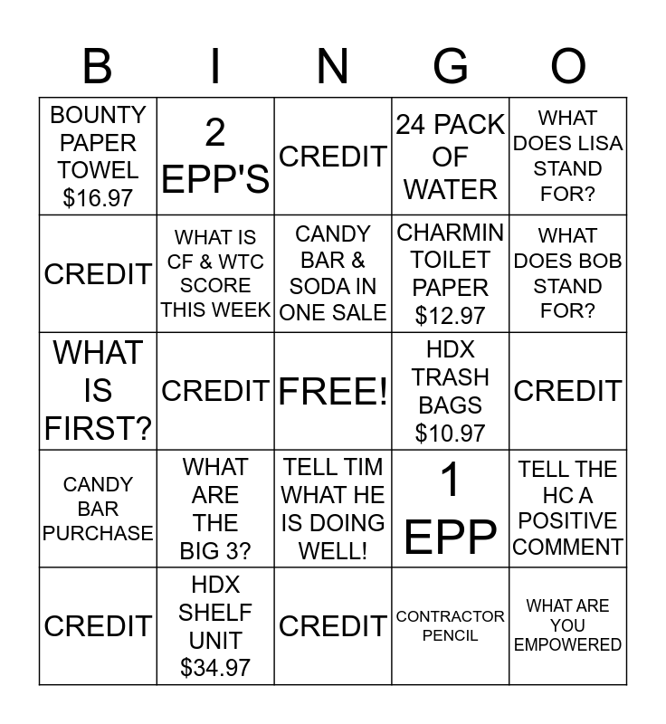 This bingo card has a free space and 24 words: WHAT ARE THE BIG 3?, HDX SHELF UNIT $34.97, CANDY BAR & SODA IN ONE SALE, CREDIT, WHAT DOES LISA STAND FOR?, BOUNTY PAPER TOWEL $16.97, CREDIT, 2 EPP'S, HDX TRASH BAGS $10.97, TELL TIM WHAT HE IS DOING WELL!, CHARMIN TOILET PAPER $12.97, WHAT IS FIRST?, 1 EPP, TELL THE HC A POSITIVE COMMENT, WHAT IS CF & WTC SCORE THIS WEEK, CONTRACTOR PENCIL, CREDIT, CREDIT, WHAT DOES BOB STAND FOR?, CREDIT, WHAT ARE YOU EMPOWERED, CANDY BAR PURCHASE, 24 PACK OF WATER and CREDIT.