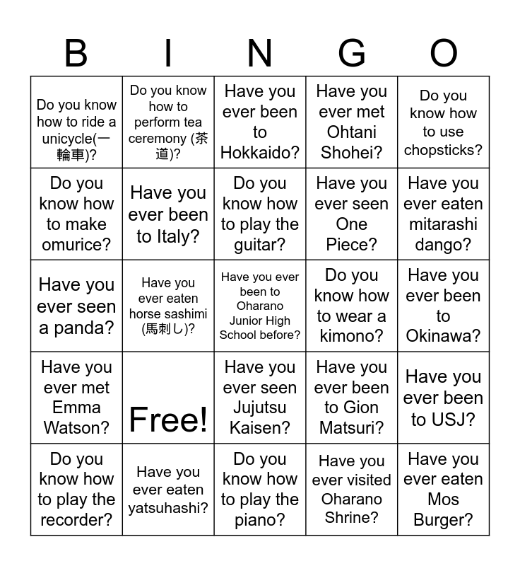 This bingo card has a free space and 25 words: Free!, Do you know how to play the piano?, Do you know how to play the guitar?, Do you know how to play the recorder?, Do you know how to use chopsticks?, Do you know how to ride a unicycle(一輪車)?, Do you know how to make omurice?, Do you know how to perform tea ceremony (茶道)?, Do you know how to wear a kimono?, Have you ever seen Jujutsu Kaisen?, Have you ever seen One Piece?, Have you ever seen a panda?, Have you ever been to Gion Matsuri?, Have you ever been to USJ?, Have you ever been to Italy?, Have you ever been to Oita?, Have you ever been to Okinawa?, Have you ever been to Hokkaido?, Have you ever eaten mitarashi dango?, Have you ever eaten horse sashimi (馬刺し)?, Have you ever eaten Mos Burger?, Have you ever eaten yatsuhashi?, Have you ever met Emma Watson?, Have you ever met Ohtani Shohei? and Have you ever visited Oharano Shrine?.