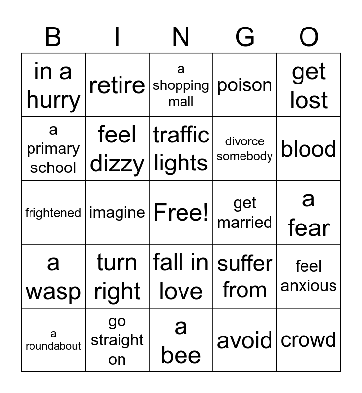 This bingo card has a free space and 24 words: turn right, go straight on, traffic lights, a roundabout, get lost, in a hurry, a primary school, retire, get married, fall in love, divorce somebody, frightened, suffer from, feel anxious, feel dizzy, avoid, a fear, a shopping mall, blood, imagine, crowd, a wasp, poison and a bee.