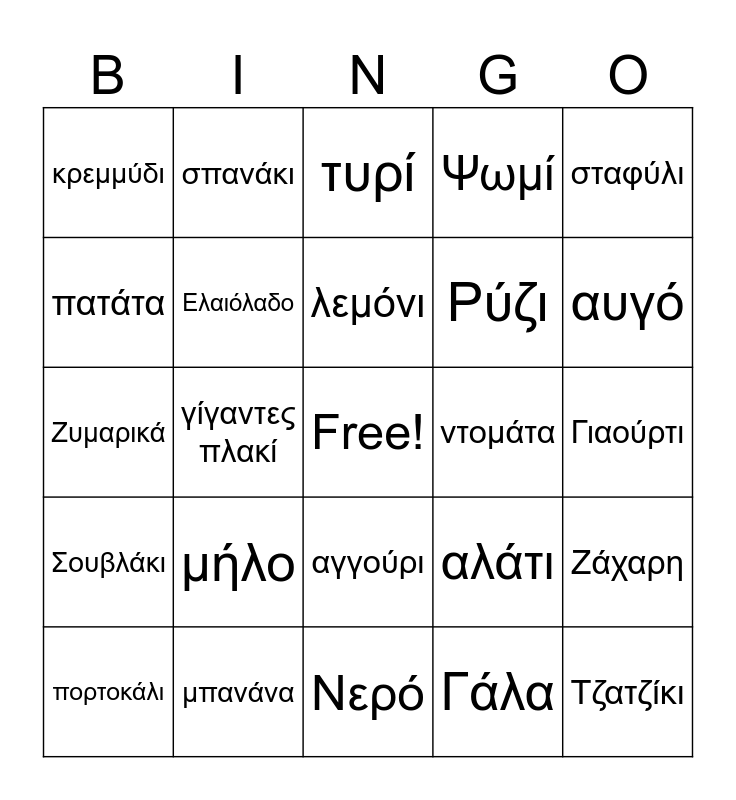 This bingo card has a free space and 24 words: μήλο, μπανάνα, λεμόνι, πορτοκάλι, σταφύλι, κρεμμύδι, πατάτα, σπανάκι, ντομάτα, αγγούρι, Ρύζι, Ζυμαρικά, αλάτι, Ζάχαρη, Ελαιόλαδο, Γάλα, Γιαούρτι, τυρί, αυγό, γίγαντες πλακί, Τζατζίκι, Σουβλάκι, Ψωμί and Νερό.