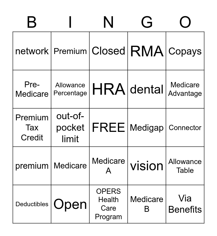 This bingo card has a free space and 24 words: Medicare, Open, HRA, Deductibles, Copays, network, Pre-Medicare, Premium, Medigap, Medicare A, dental, Premium Tax Credit, vision, Allowance Table, Allowance Percentage, Medicare B, Connector, Closed, Medicare Advantage, out-of-pocket limit, Via Benefits, premium, RMA and OPERS Health Care Program.