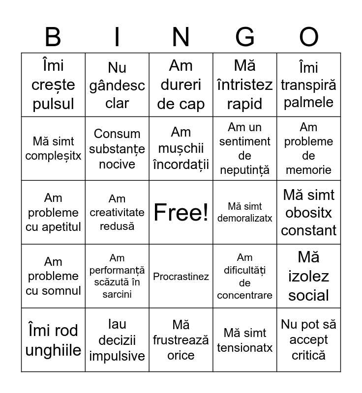 This bingo card has a free space and 24 words: Îmi rod unghiile, Am performanță scăzută în sarcini, Am mușchii încordații, Mă simt tensionatx, Îmi transpiră palmele, Îmi crește pulsul, Nu gândesc clar, Am dureri de cap, Mă simt demoralizatx, Mă simt obositx constant, Am probleme cu apetitul, Consum substanțe nocive, Am dificultăți de concentrare, Mă izolez social, Mă simt compleșitx, Iau decizii impulsive, Mă frustrează orice, Mă întristez rapid, Am probleme de memorie, Am probleme cu somnul, Am creativitate redusă, Procrastinez, Am un sentiment de neputință and Nu pot să accept critică.