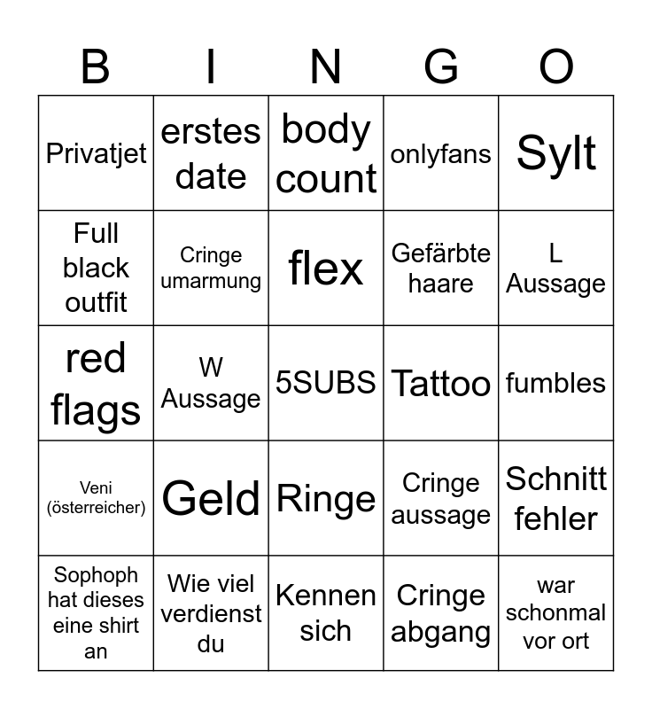 This bingo card has a free space and 24 words: Geld, Wie viel verdienst du, flex, Sophoph hat dieses eine shirt an, Sylt, Privatjet, Full black outfit, erstes date, Tattoo, Ringe, Gefärbte haare, red flags, Cringe aussage, Schnitt fehler, Cringe umarmung, Cringe abgang, fumbles, body count, L Aussage, W Aussage, war schonmal vor ort, Veni (österreicher), onlyfans and Kennen sich.