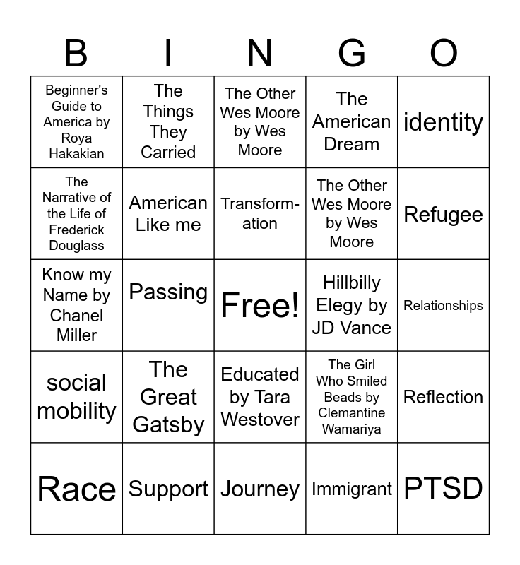 This bingo card has a free space and 29 words: Race, Class, Passing, Their Eyes Were Watching God, Beginner's Guide to America by Roya Hakakian, The Other Wes Moore by Wes Moore, American Like me, The Great Gatsby, Hillbilly Elegy by JD Vance, Support, Relationships, PTSD, Journey, Immigrant, Refugee, Quote, Educated by Tara Westover, social mobility, identity, Know my Name by Chanel Miller, The Girl Who Smiled Beads by Clemantine Wamariya, Obstacle, The Other Wes Moore by Wes Moore, The Narrative of the Life of Frederick Douglass, The American Dream, The Things They Carried, Reflection, Transform-ation and Individualism.