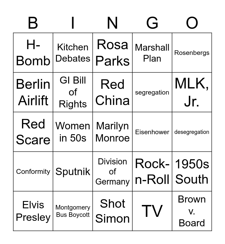 This bingo card has 35 words: HAPPY DAYS (1953-60), BEST YEARS (1946-52), Baby Boomers, GI Bill of Rights, Division of Germany, Marshall Plan, Berlin Airlift, Stalin, Red China, Korean War, Red Scare, Rosenbergs, McCarthyism, MacArthur, H-Bomb, Eisenhower, TV, Women in 50s, Conformity, Marilyn Monroe, Rock-n-Roll, Elvis Presley, 1950s South, Montgomery Bus Boycott, Rosa Parks, MLK, Jr., Brown v. Board, Little Rock, segregation, desegregation, Highways, Shot Simon, Sputnik, Kitchen Debates and Richard Nixon.