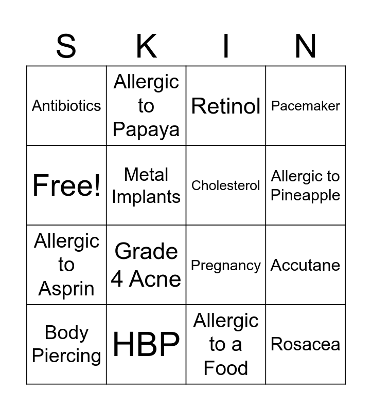 This bingo card has 16 words: HBP, Accutane, Retinol, Antibiotics, Allergic to Asprin, Allergic to Papaya, Pregnancy, Allergic to a Food, Free!, Metal Implants, Body Piercing, Pacemaker, Grade 4 Acne, Allergic to Pineapple, Cholesterol and Rosacea.