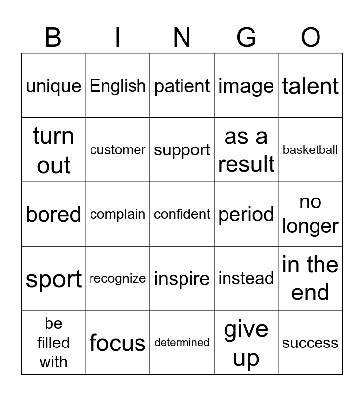 This bingo card has 25 words: recognize, determined, support, be filled with, talent, unique, turn out, English, period, inspire, as a result, bored, instead, in the end, customer, success, no longer, patient, basketball, complain, confident, focus, sport, image and give up.