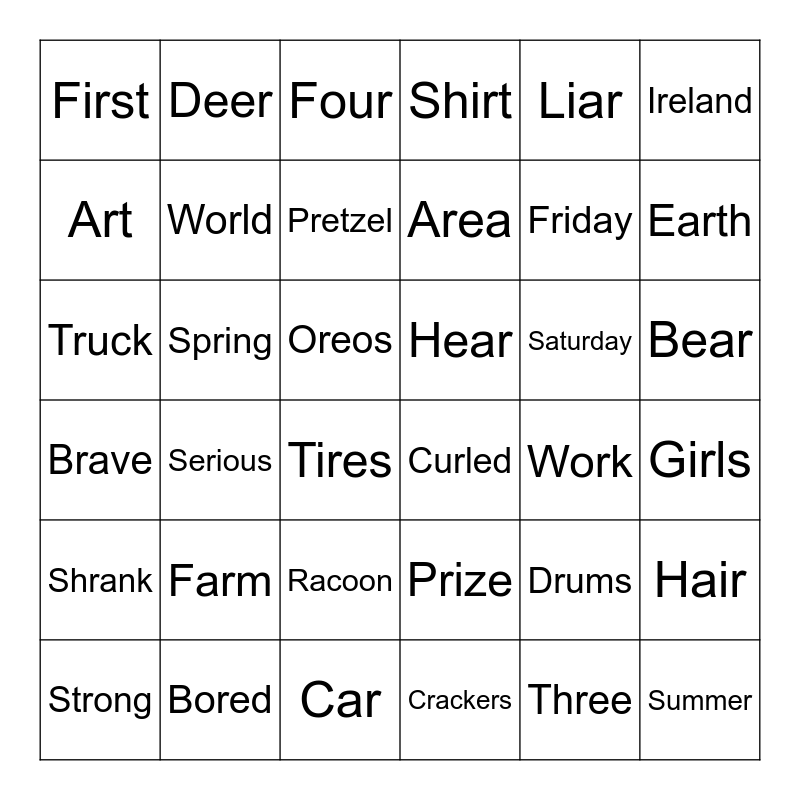 This bingo card has 36 words: Prize, Racoon, Crackers, Art, Brave, Hear, World, Car, Liar, Drums, Earth, Shirt, Hair, Spring, Area, First, Shrank, Saturday, Truck, Four, Oreos, Serious, Curled, Tires, Work, Deer, Friday, Bored, Pretzel, Ireland, Summer, Strong, Girls, Bear, Farm and Three.