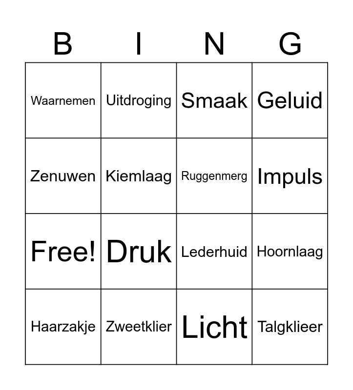 This bingo card has 20 words: Hoornlaag, Bloedvaten, Smaak, Afkoelen, Haarzakje, Zenuwen, Zweetklier, Waarnemen, Free!, Uitdroging, Druk, Lederhuid, Kiemlaag, Talgklieer, Ruggenmerg, Hersenen, Impuls, Geluid, Licht and Prikkel.
