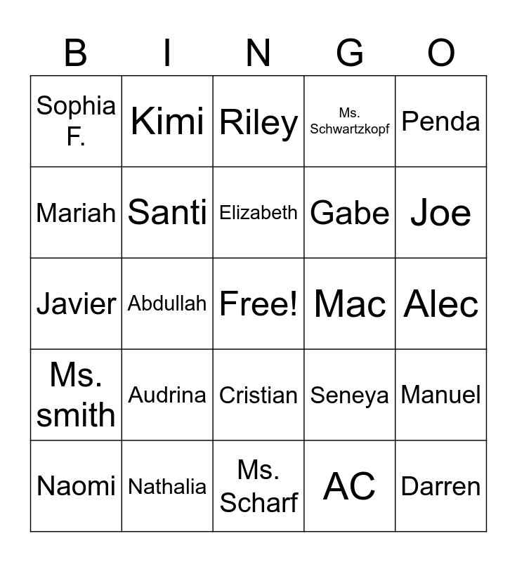 This bingo card has a free space and 24 words: Audrina, Nathalia, Elizabeth, Naomi, Penda, Sophia F., Mariah, Kimi, Mac, Cristian, Gabe, Javier, Seneya, Manuel, Santi, AC, Alec, Riley, Joe, Abdullah, Darren, Ms. smith, Ms. Schwartzkopf and Ms. Scharf.