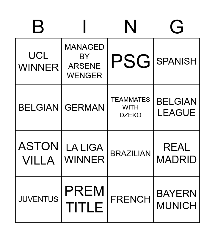 This bingo card has 16 words: PREM TITLE, REAL MADRID, PSG, UCL WINNER, ASTON VILLA, MANAGED BY ARSENE WENGER, BRAZILIAN, FRENCH, BELGIAN, GERMAN, JUVENTUS, SPANISH, LA LIGA WINNER, BELGIAN LEAGUE, TEAMMATES WITH DZEKO and BAYERN MUNICH.