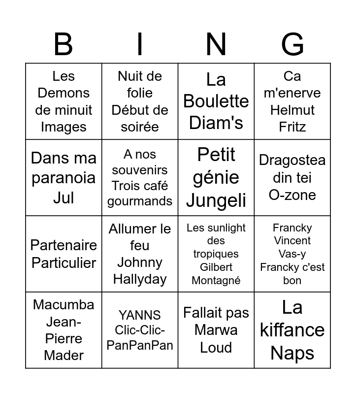 This bingo card has 16 words: YANNS Clic-Clic-PanPanPan, Francky Vincent Vas-y Francky c'est bon, La Boulette Diam's, Les Demons de minuit Images, Partenaire Particulier, Nuit de folie Début de soirée, Les sunlight des tropiques Gilbert Montagné, Fallait pas Marwa Loud, Dans ma paranoia Jul, A nos souvenirs Trois café gourmands, Macumba Jean-Pierre Mader, Ca m'enerve Helmut Fritz, Allumer le feu Johnny Hallyday, Dragostea din tei O-zone, Petit génie Jungeli and La kiffance Naps.