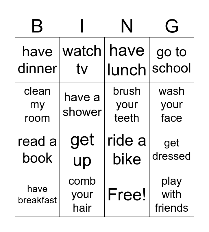 This bingo card has 17 words: Free!, have breakfast, have lunch, have dinner, get up, go to school, get dressed, brush your teeth, wash your face, have a shower, comb your hair, ride a bike, clean my room, watch tv, read a book, do homework and play with friends.