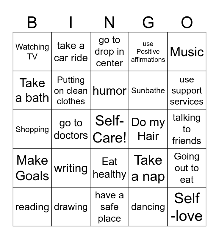 This bingo card has a free space and 24 words: writing, drawing, humor, reading, Music, Watching TV, Take a bath, take a car ride, Do my Hair, Eat healthy, Sunbathe, Shopping, Take a nap, Going out to eat, Putting on clean clothes, dancing, talking to friends, go to drop in center, use support services, go to doctors, Self -love, Make Goals, use Positive affirmations and have a safe place.