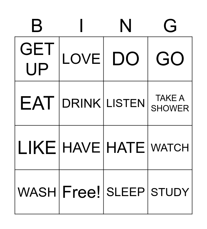 This bingo card has 16 words: Free!, WATCH, DO, GET UP, LIKE, LOVE, HATE, SLEEP, EAT, DRINK, WASH, GO, HAVE, TAKE A SHOWER, LISTEN and STUDY.