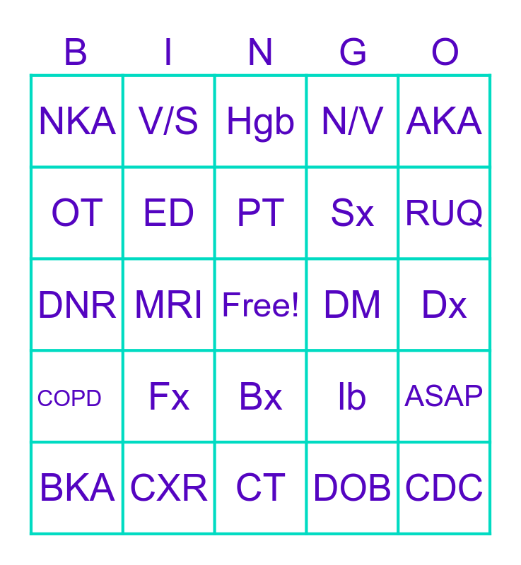 This bingo card has a free space and 44 words: Ad lib, CDC, ASA, BKA, NPO, DOB, Hgb, BPH, AKA, CXR, N/V, DM, Bx, Fx, PO, CT, RBC, DNR, UA, RUQ, V/S, Tx, UTI, NKA, f/u, Dx, L, I&O, lb, COPD, CMS, ASAP, D/C, HTN, MRI, Hct, RUE, LLL, PT, OT, Sx, NSAID, ED and ICU.