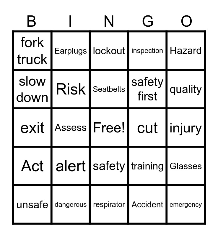 This bingo card has a free space and 32 words: Accident, Awareness, Assess, Anticipate, Act, Risk, Hazard, Glasses, Earplugs, Gloves, Seatbelts, lockout, tagout, bandage, cut, fall, unsafe, exit, safety, alert, training, fire, injury, dangerous, emergency, inspection, safety first, slow down, fork truck, respirator, maintenance and quality.