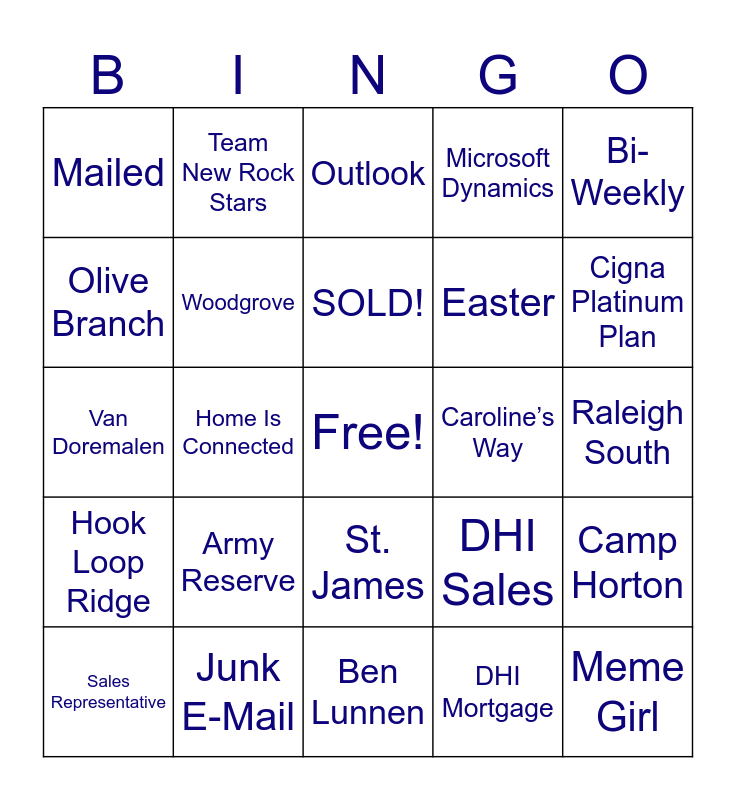 This bingo card has a free space and 71 words: Microsoft Teams, Team New Rock Stars, Marketing Color Copier 2.0, Duo Authentication, Ben Lunnen, 1978, Microsoft Dynamics, DHI Central, Easter, Verizon, Sales Representative, P:drive, Cigna Platinum Plan, Mailed, 4 Main Offices, Van Doremalen, DHI Sales, Bi-Weekly, Sales Agreements, Raleigh South, Army Reserve, Meme Girl, Camp Horton, Helpdesk, RRAR, NCREC, The 4:2 Formula, Training Agenda, I-9, Video Shops, Junk E-Mail, Email Signature, Home Builders Association, TSMC, DHI Mortgage, Builder Forward, Anderson Farm, Fletcher’s Mill, Olive Branch, Galvin’s Ridge, St. James, Laurel Oaks, Hook Loop Ridge, Southbury, Carriage Place, Varina Gateway, Matthew’s Landing, Woodgrove, McKay Place, Collins Ridge, Carter Ridge, Laurel Ridge, Caroline’s Way, PotBelly, Red Tag Sale, DocuSign, SOLD!, Commission, Co-Broker, Angel Tree, Employee Referral, Microsoft Surface, Home Is Connected, 5 Star Survey, Sales Rally, Training Calendar, Outlook, Sales Absolutes, The 4:2 Formula, Lead Conversion and Employee Referral.