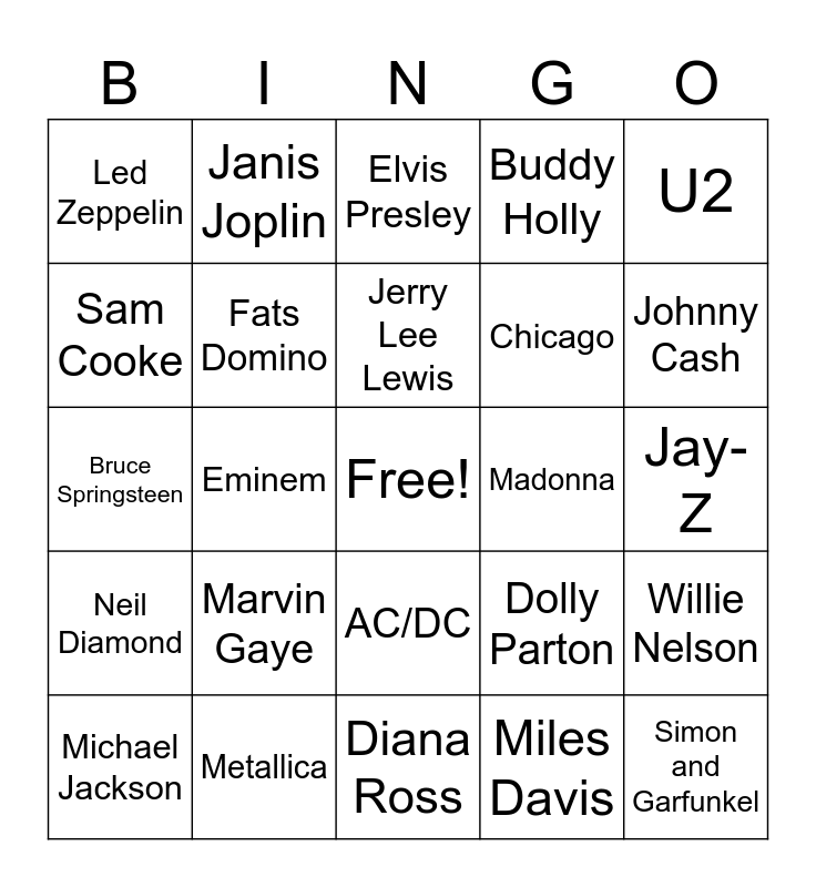 This bingo card has a free space and 79 words: The Beatles, Frank Sinatra, Elvis Presley, The Rolling Stones, Chuck Berry, Jimi Hendrix, James Brown, Little Richard, Aretha Franklin, Whitney Houston, Bob Marley, The Beach Boys, Buddy Holly, Led Zeppelin, Stevie Wonder, Sam Cooke, Ella Fitzgerald, Marvin Gaye, The Velvet Underground, Jay-Z, Queen, U2, Bruce Springsteen, Jerry Lee Lewis, Fats Domino, Mariah Carey, Prince, The Clash, The Who, Nirvana, Johnny Cash, Pink Floyd, Diana Ross, Neil Young, Michael Jackson, Madonna, The Eagles, John Lennon, David Bowie, Simon and Garfunkel, The Doors, Van Morrison, Louis Armstrong, Public Enemy, The Byrds, Janis Joplin, Hank Williams, Run-DMC, Elton John, Nat King Cole, Willie Nelson, Eminem, Dolly Parton, Garth Brooks, Drake, Beyonce, Etta James, Bon Jovi, Ozzy Osbourne, AC/DC, Chicago, Santana, Kenny Rogers, Tina Turner, Billy Joel, Merle Haggard, Judy Garland, Fleetwood Mac, Britney Spears, Neil Diamond, Metallica, Rihanna, Celine Dion, Radiohead, The Police, Miles Davis, Barbara Streisand, Bing Crosby and The Bee Gees.