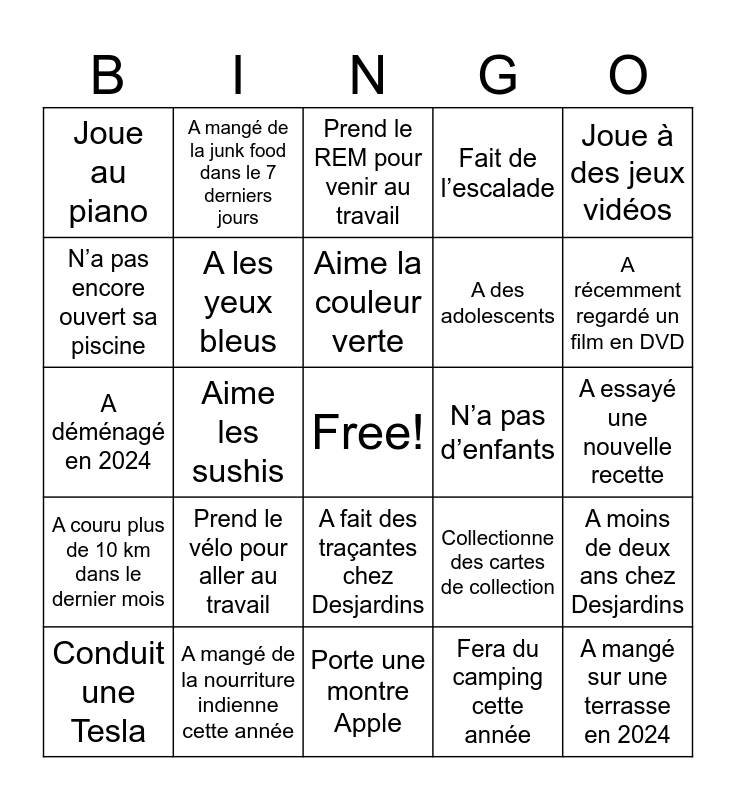 This bingo card has a free space and 24 words: Prend le vélo pour aller au travail, A mangé de la nourriture indienne cette année, Aime la couleur verte, Conduit une Tesla, Joue à des jeux vidéos, Joue au piano, N’a pas encore ouvert sa piscine, A mangé de la junk food dans le 7 derniers jours, N’a pas d’enfants, A fait des traçantes chez Desjardins, A des adolescents, A déménagé en 2024, Collectionne des cartes de collection, A moins de deux ans chez Desjardins, A les yeux bleus, Fera du camping cette année, A essayé une nouvelle recette, Prend le REM pour venir au travail, A récemment regardé un film en DVD, Aime les sushis, A mangé sur une terrasse en 2024, A couru plus de 10 km dans le dernier mois, Fait de l’escalade and Porte une montre Apple.
