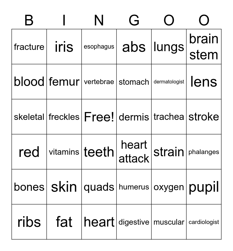 This bingo card has 36 words: humerus, quads, digestive, blood, red, dermis, femur, heart, lungs, oxygen, lens, abs, pupil, freckles, stomach, fracture, bones, trachea, skeletal, esophagus, Free!, vitamins, heart attack, teeth, strain, iris, dermatologist, fat, vertebrae, brain stem, cardiologist, ribs, phalanges, stroke, skin and muscular.