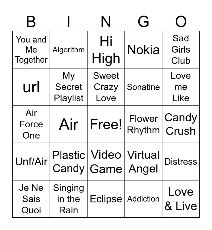 This bingo card has a free space and 39 words: The Hitchiker's Guide to the Galaxy, Sparkle, Birth, Virtual Angel, Distress, Unf/Air, Air, Butterfly Effect, Flower Rhythm, Candy Crush, url, Algorithm, Lucid, Love me Like, Air Force One, Plastic Candy, Video Game, Nokia, The Carol 3.0, Je Ne Sais Quoi, My Secret Playlist, Sweet Crazy Love, Addiction, Sad Girls Club, Love Cherry Motion, Singing in the Rain, Eclipse, Vivid, Let Me In, You and Me Together, Starlight, Girl Front, Sonatine, Love & Live, Fairy Tale, Chaotic, Hi High, Colors and Butterfly.