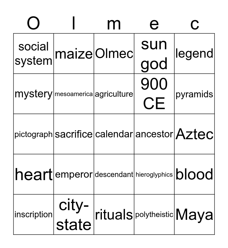 This bingo card has 25 words: emperor, rituals, agriculture, inscription, legend, social system, mystery, maize, ancestor, descendant, 900 CE, pictograph, hieroglyphics, blood, mesoamerica, Maya, Aztec, Olmec, pyramids, sacrifice, calendar, city-state, heart, sun god and polytheistic.
